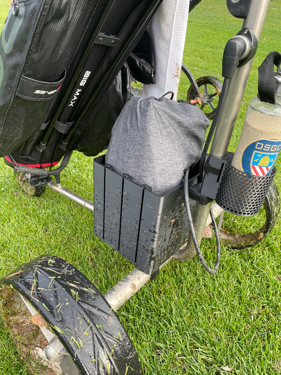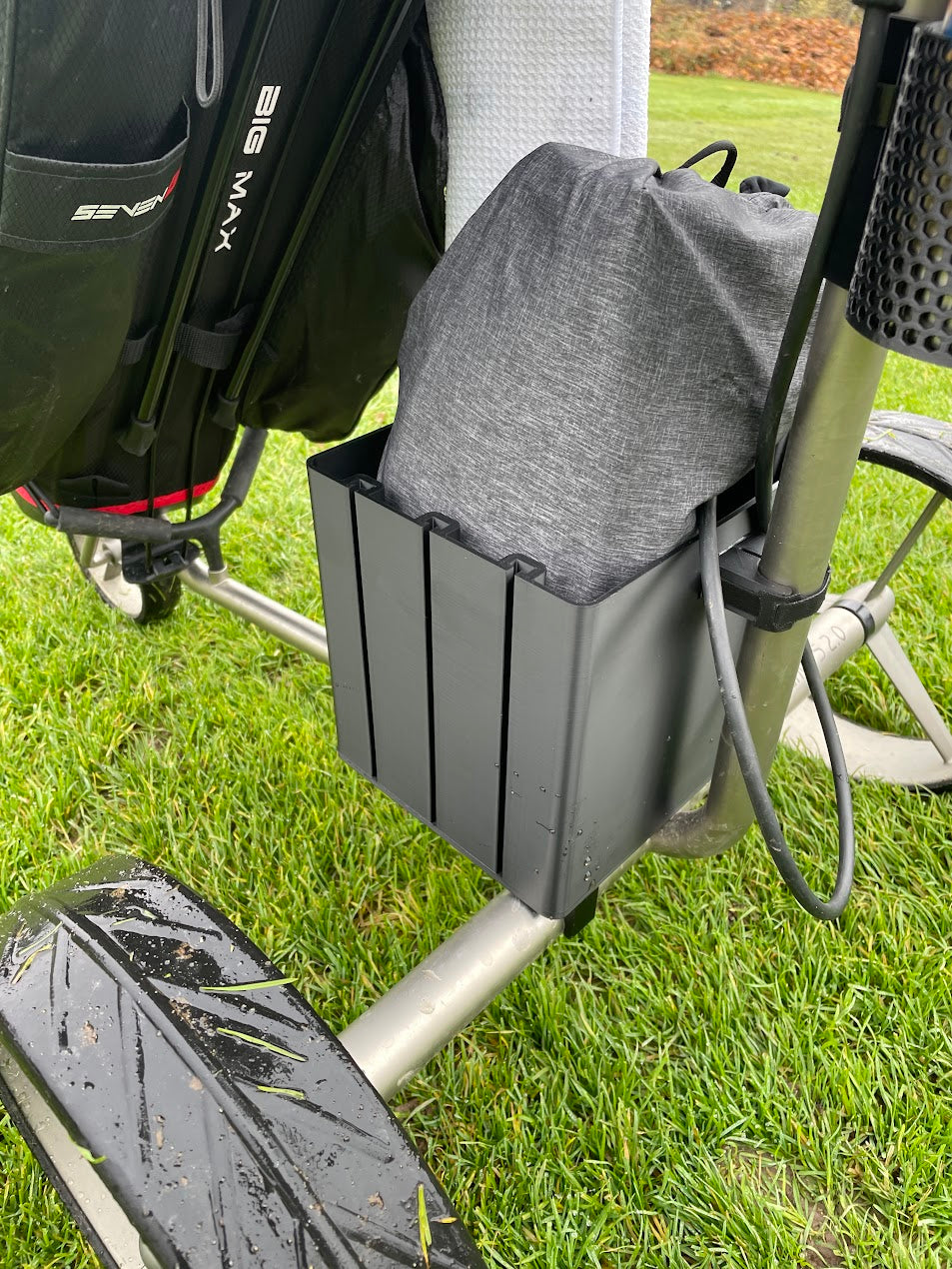 Kann einfach an den JuCad/JuStar angeknipst werden. Praktisch um Regenkleider, Verpflegung oder Ersatzbälle mitzunehmen. Akku kann einfach hineingestellt werden mit weiteren Utensilien.